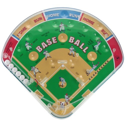 This pinball game is a true classic. Shoot the balls up the right side and keep track of the points as the balls plink off the pegs and land in the slots. Highest score wins. Made of plastic. Measures approximately 13" x 6.5" x 2.5".Baseball Pinball Game Specifications