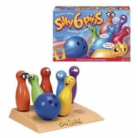 Sally, Stevie, Stanley, Sophie, Stewie, and Sid are six colorful, lightweight bowling pins--each with their own personality--that talk to kids while they bowl. Taunts such as "C'mon! Roll the ball already!" get kids started, and phrases such as "Whew! That was close," keep them aiming for the pins. Bells, whistles, and cheers are heard if a spare or strike is bowled. The tan plastic base has six colored circles to hold the pins in place, but it is not required that colors match up for a game to begin. Silly 6 Pins only keeps score one frame (two balls) at a time, so keep a pad of paper nearby if you're playing as a family. Three AA batteries are required, but not included. --Pam LauerElectronic Talking Silly 6 Pins by hasbro Specifications